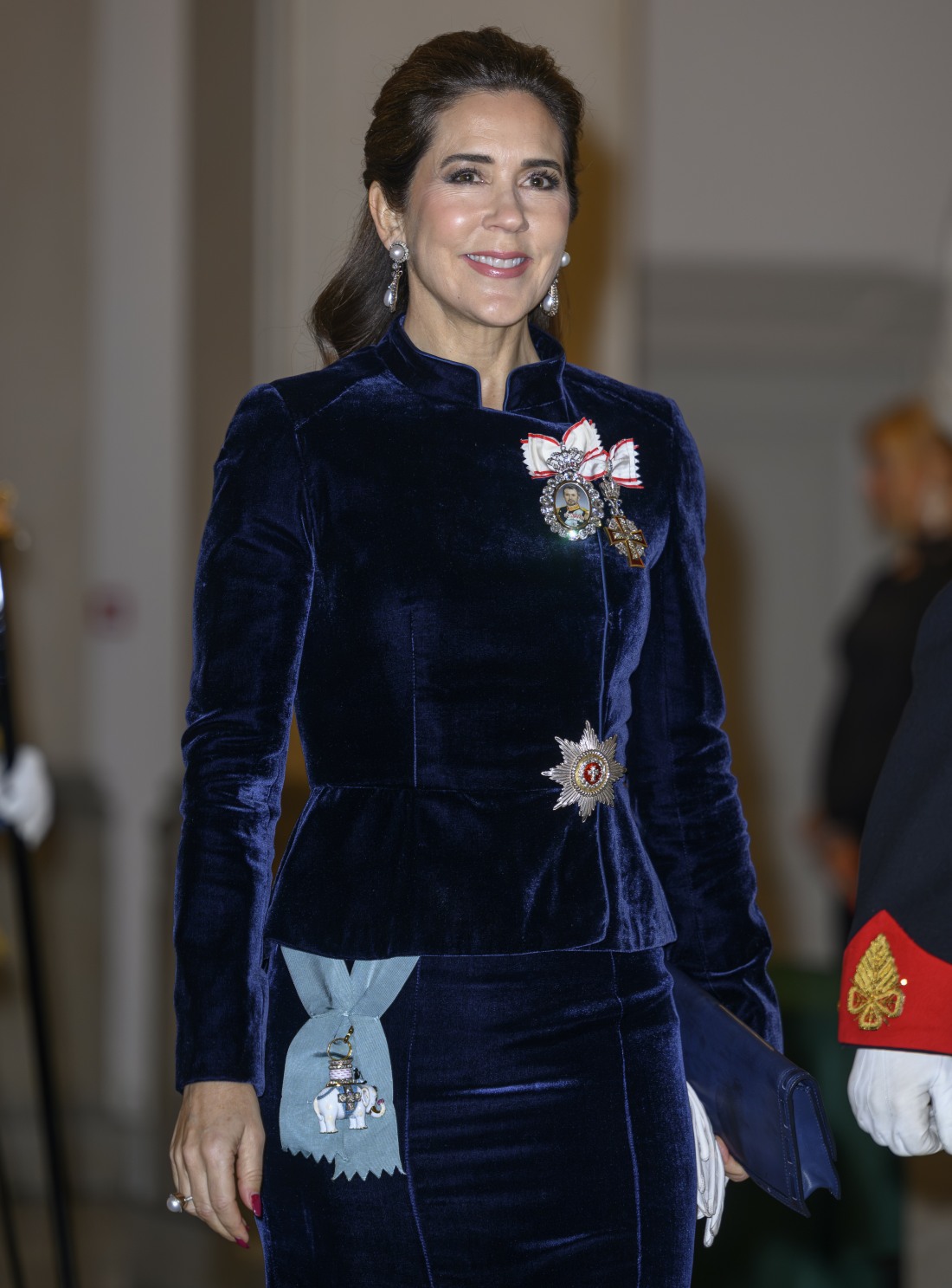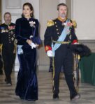 Denmark’s King Frederik and Queen Mary hosted their annual New Year’s party/reception last week, and I didn’t really like Mary’s NYE dress. I loved her custom tiara though, it was beautiful. Well, on Monday, they hosted yet more New Year’s receptions and events. These photos are from the diplomatic corps reception at Christiansborg Palace. I much prefer Mary’s look in these photos – a love a rich velvet, and this midnight blue shade is gorgeous and lux. The cut of the jacket and skirt is so flattering and elegant. If you’re wondering about all of her jewelry and orders, she wore pearl earrings from the Khedive of Egypt Parure, alongside the sash and star of the Order of the Elephant, with King Frederik’s Portrait Order.