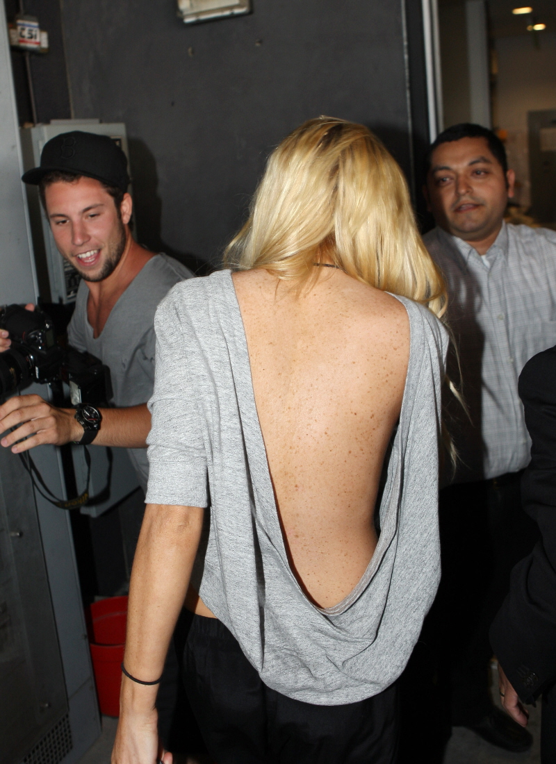I call this photo, “The Crackhead in the Mirror”. In case your couldn’t tell, this is Lindsay Lohan out and about in LA, braless and wearing some f-cked up backless sweatshirt. Classy. Anyway, exactly ten days ago, Lindsay Lohan’s bail was revoked and a new bench warrant with a new $200,000 bail was set. Lindsay made bail within hours, but the drama continued about exactly what went down. Not-so-allegedly, Lindsay Lohan had a drink or two while out partying after the MTV Movie Awards. Maybe her SCRAM bracelet let off some kind alarm, maybe not. But when the prosecution and the judge met the next day to go over the data that the SCRAM had accumulated, they determined that Lindsay had been consuming alcohol, in violation of her probation. Now, according to Lindsay’s lawyer, Lindsay took a urine test “shortly after the alert” and it came back “negative” for alcohol. What the hell?