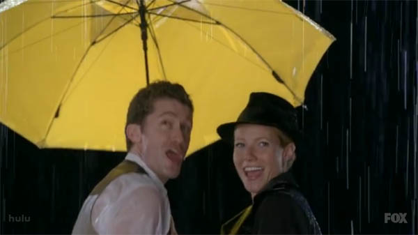 Sue abruptly gives Shue his job back, after the LeCar/tater tot debacle. The Glee club gives him a hero’s welcome, though they’re bummed that he returns to his tradition of old song choices with a song from “Singin’ in the Rain.” He calls in Holly to make “it more relevant,”and they close the episode with Musical Number #5, a mash-up of “Singin’ in the Rain” with Rihanna’s “Umbrella.” It’s visually stunning, but the mash-up doesn’t work for me. But honestly, it’s too fabulous across the board, so giant thumbs up for Gwyneth on Glee. Gleeneth