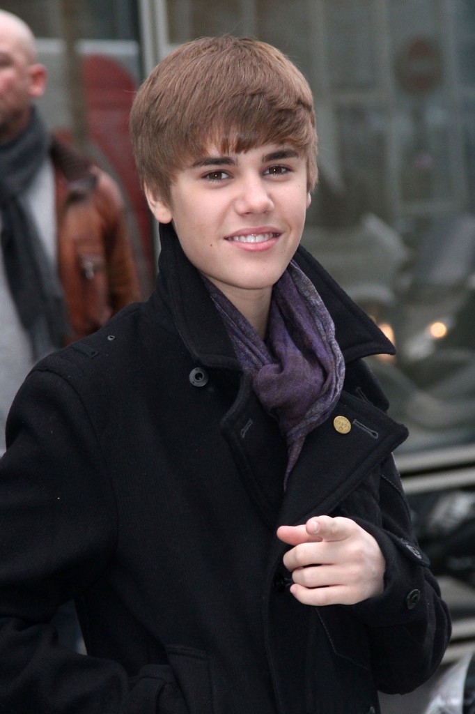 Bieber is shown with his old hair, below, in Paris on 2/17/11. Credit: WENN.com