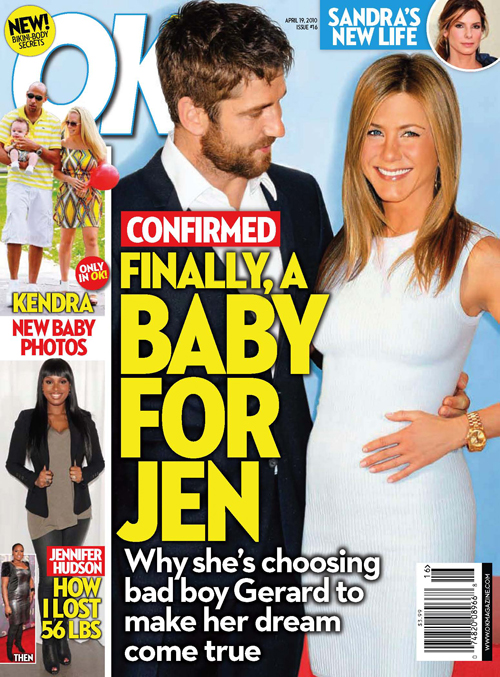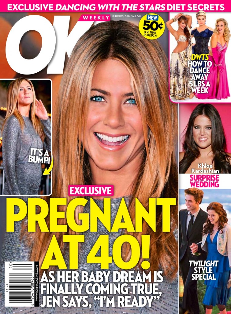 Jennifer Aniston appears on the cover of OK! in what looks like a repeat of so many of their earlier covers. It’s all about Jen and the baby she says she might eventually have. Here are some other cover stories OK! has run in the past couple of years that are variations on this theme: (And OK! is not the only offender)