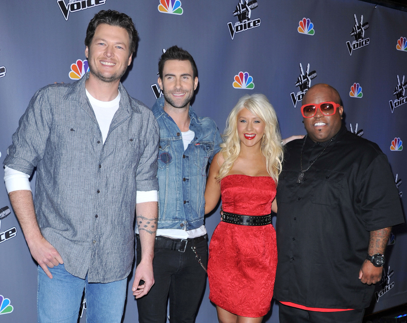 Sporting spiked shoes and a red dress, Aguilera joined singer Cee Lo Green and Maroon 5’s Adam Levine for a press conference in Los Angeles to talk about new show The Voice, premiering April 26 on NBC. Washington Post columnist Lisa de Moraes says reporters were kept waiting for more than an hour for a 20-minute Q & A session.