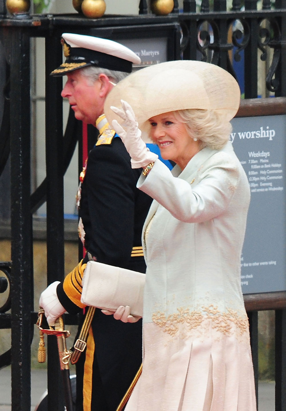 Camilla announced well ahead of time that she would be wearing her designer of choice Anna Valentine, who designed the off white gown and long jacket she wore for her wedding to Prince Charles in 2005. Valentine has created many dresses for Camilla over the years so her designer choice for the royal wedding wasn’t surprising.