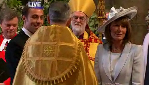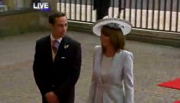 Like her daughter, mother of the bride Carole Middleton kept her wedding attire a secret before the big day. It was thought that she would wear designer Lindka Cierach, but has instead chosen Catherine Walker with a Jane Corbett hat. Kate’s former stylist explained on CNN that Catherine Walker was Princess Diana’s favorite designer. Walker passed away last October, and Carole’s choice, announced right before she arrived at the wedding, was significant as both a homage to Diana and the late designer.