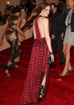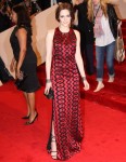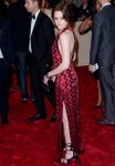 Here is little Kristen Stewart working an off-beat red-and-black patterned Proenza Schouler gown at last night’s Met Gala (which was a tribute to McQueen, “Alexander McQueen: Savage Beauty”). Do I have to suck it up and admit to liking something that K-Stew did? Kind of. While this dress isn’t what I would choose for a red carpet, and it’s not what I would have picked out for Kristen (if I was styling her in some kind of dream situation), the dress looks pretty good on her.