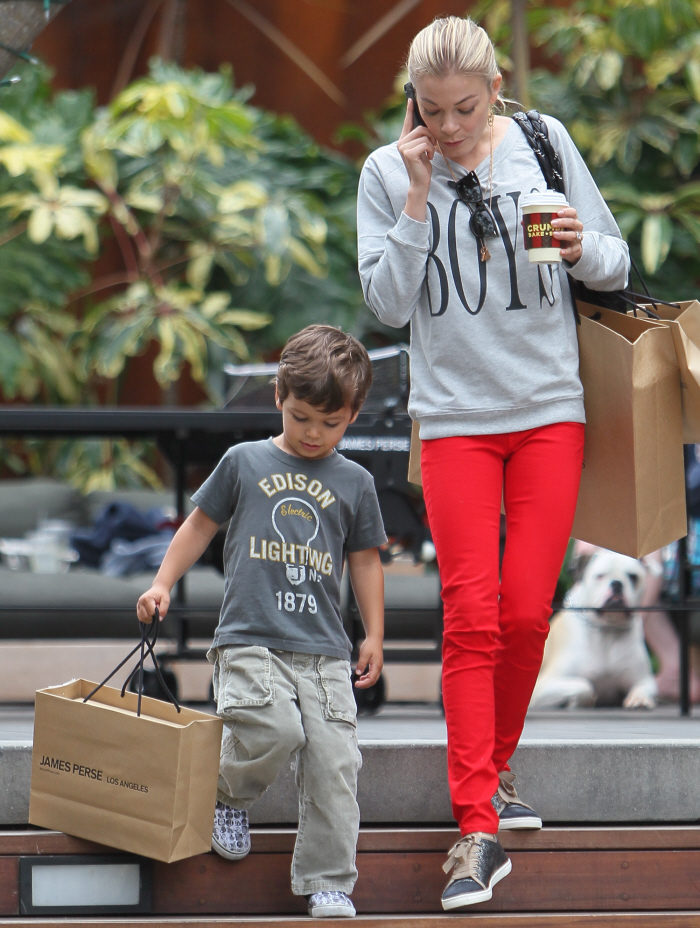 Here are some new photos of LeAnn Rimes and her stepson Mason Cibrian out and about in LA yesterday. This is one of the few times I’ve seen photos of LeAnn with one of Eddie and Brandi’s kids, without Eddie or Brandi around somewhere. LeAnn gets to be a solo step mom! And a pap-friendly one at that. I know in my heart that these photos are staged, and I know the image LeAnn was aiming for. She’s trying to look like A Professional Busy Person Who Happens To Be The World’s Greatest (Step) Mother. Through the series of photos, you can actually see that LeAnn had her sunglasses on, and she and Mason were being friendly and cute, but when she saw the paparazzo, she took off the sunglasses, took out her cellphone and tried to pose-but-not-pose. It’s kind of sad, really. She should have just been paying attention to Mason, who… let’s face it, he’s a little heartbreaker already. He’s so adorable.