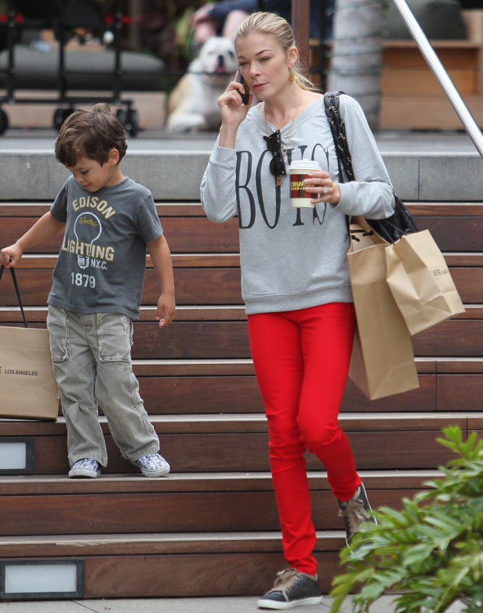 Friday, LeAnn Rimes managed to garner some attention by wearing a cartoonish awful ensemble while shopping with one of her stepsons, presumably for Father’s Day. Incidentally, she also denied – on Twitter – the existence of a sex tape with her ex-husband, Dean. So, it’s safe to say that LeAnn pap’d herself because she needed some attention, which everyone gave her, so that’s all good.