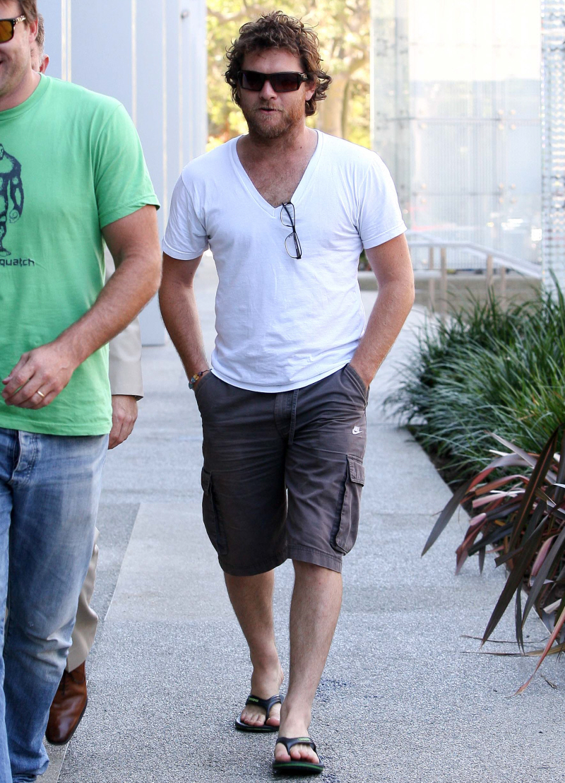 I think CB still likes Sam Worthington, and I’m actually starting to come around on this meathead. He doesn’t seem like a bad guy, he’s just kind of rough around the edges. He has potential. He’s no Fassbender, but he’ll do in a pinch. And these new photos of him – he was out to lunch in LA with David Spade, of all people – are pretty hot to me. You know I like ‘em scruffy. Sam looks better scruffy. I can’t even hate on his shorts!