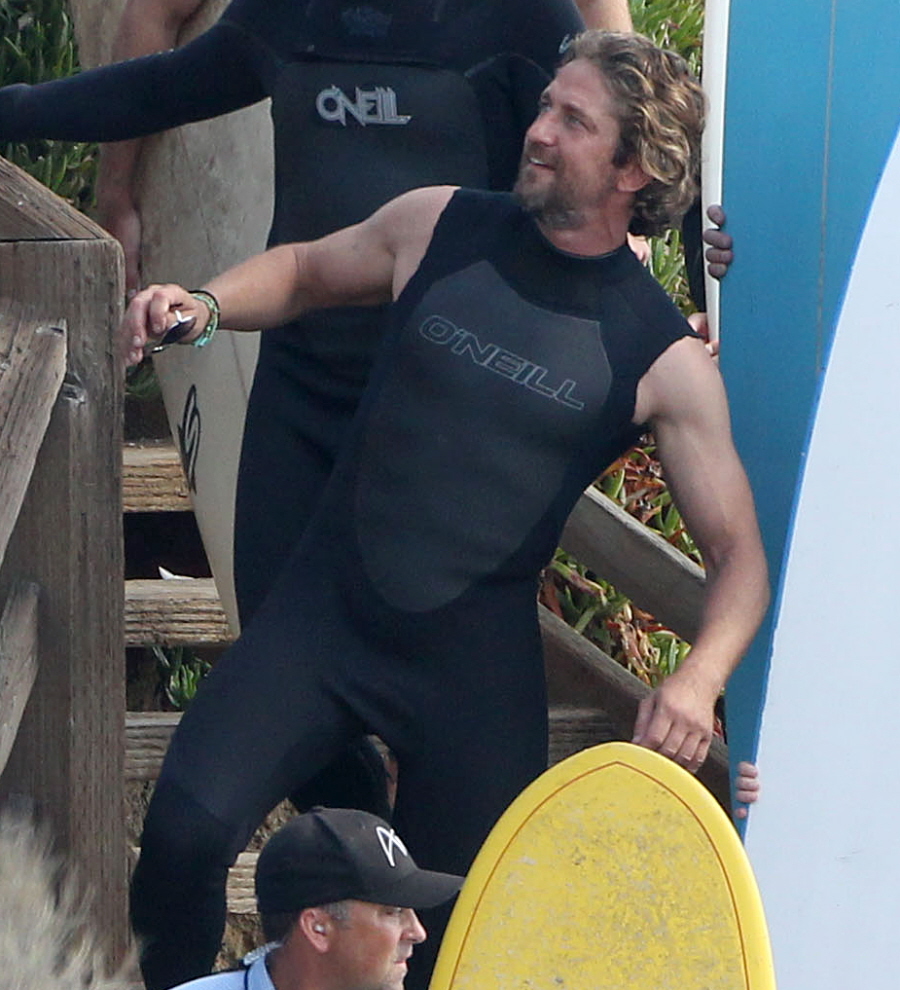 Anyway, as we’ve been chronicling over the past year, Gerard Butler has slowly and steadily lost the chunk. Specifically over the past few months, he’s been training for this surf movie, Of Mavericks and Men. Gerard plays the surfing elder in this one, and yet it seems like he’s the lead, considering he’s getting endlessly pap’d in various stages of dong-y undress. These are newish photos from the weekend, and Gerry looks… well…