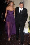 Stacy is wearing this purple Maria Lucia Hohan (the same designer of the dress Stacy wore in London). It’s awful, isn’t it? Stacy had been steadily improving, but I fear we are witnessing a D-list relapse! It looks like a really bad pageant dress, only I don’t even think that pageant girls wear these kinds of boob-embellishment gowns anymore. Plus, the bottom half is sheer, and that dress feature is… rather tacky. In this instance. Um, are those built-in black bicycle shorts underneath the sheer skirt? WTF? Why do Clooney’s girls always look like strippers that got off of an eight-hour shift? And why does Clooney keep pointing to Stacy’s poor vagina?