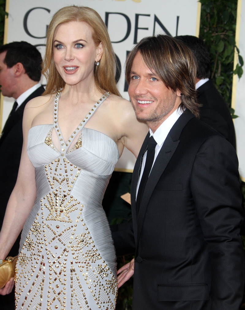 So, Nicole was at the Globes with her husband Keith Urban. Nicole was there to present – with Clive Owen!! – and promote Hemingway & Gellhorn, the HBO movie she and Clive did together. Nicole wore this studded Versace gown which… on one hand, I like it. It flatters her body, it’s not a sack, it’s not a lace doily, and it’s not overly frilly, which it what Nicole does too often. I like the idea of Nicole in studded Versace – she used to be more rock n’ roll, and studded Versace is always a good idea. That being said, it’s still too light for Nicole. It washes her out. And the bust on the dress makes her tatas look super-fake and bolt-on-y. Which they very well might be, but still.