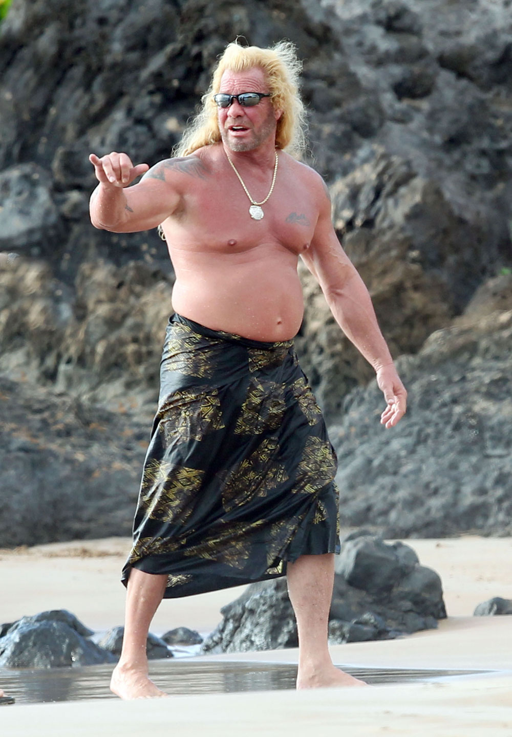 The Bounty Hunters, Duane & Beth Chapman spend a relaxing day at the beach and they even brought their Dog! Duane “The Dog” Chapman and his wife, Beth were spotted taking some time off catching criminals to catch a little sun in Hawaii and they seemed to have had no problem as Duane was looking a little red as he cooled off in the Ocean wearing a sarong in Maui, Hawaii on March 18, 2012. Duane seems to have packed on a few pounds…look at that belly!