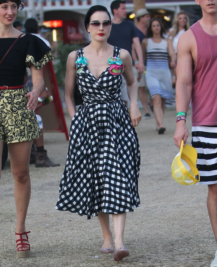 I love Dita and think she’s beautiful, but it was 106 degrees at Coachella…I went to Weekend 1 and other friends went to Weekend 2 and told me about how hot it was. It’s ridiculous to go out in a full face of makeup and a fancy outfit when it’s that hot outside in my opinion. She could have worn some retro style capri pants, sandals and maybe a blouse and managed to rock the vintage Bettie Page look and yet be a little more appropriately dressed for the weather.