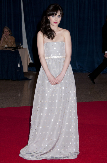 Zooey needed to reach down and hoist that dress upwards about 4 inches. It was falling off.