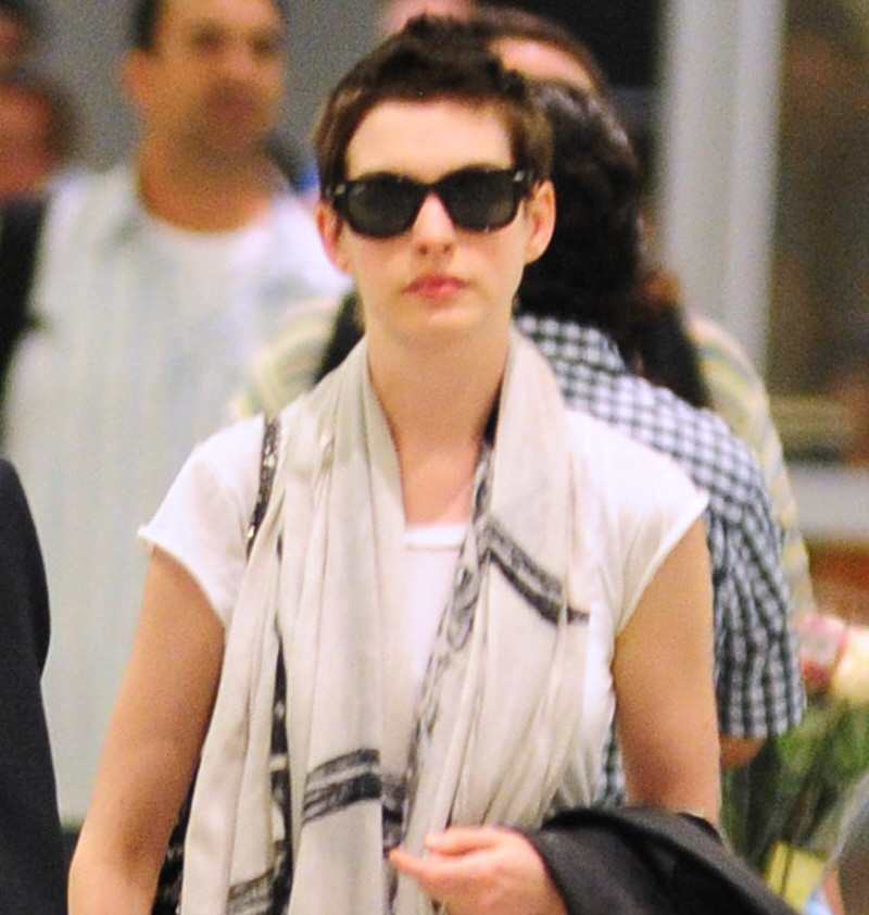 I’ve been wanting to talk about this stuff for DAYS but we’ve only just gotten these new photos of Anne Hathaway, so I’m using them as an excuse to discuss all things Raffaello Follieri. First, these are new photos of Anne and her fiancé Adam Shulman at LAX, heading onto a flight to NYC, then arriving in NYC the same day (yesterday). Anne’s newly-shorn hair is definitely looking a bit better. I think she might even be rocking a slight faux-hawk in some of these pics, which… would be an awesome look for her. She chopped it off for Les Miserables, and I think it’s going to be a bitch for her to grow back. I’m predicting some really awkward stages.