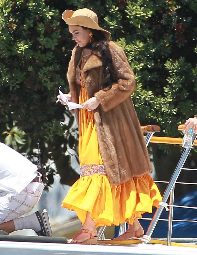 Another day, another post devoted to photos of Lindsay Lohan playing the most cracked-out version of Elizabeth Taylor ever. At least Lindsay’s crack-boobs are covered up in these photos, although you can tell that she’s hyper-aware of the paparazzi and she’s trying to give them some poses. Quick question: does this entire Lifetime movie take place on a boat? Because they only seem to be filming scenes on this damn boat. I guess this pier is supposed to be standing in for Italy, London, Greece, and everywhere else Liz & Dick’s romance took them. It’s kind of sad.