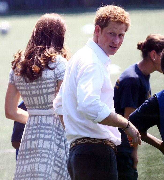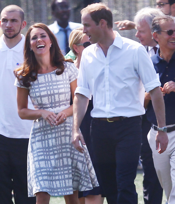 I hope these are the first of many photos that we will get of the younger royals at Olympic events in the next two weeks. Are you excited? I’m excited. I can’t wait to see the swimming. And the beach volleyball! And the gymnastics, which is my favorite event. Prince Harry, Prince William and The DOC (the Duchess of Cambridge, I’m trying out a new nickname for Kate) were photographed earlier today “on the football pitch at Bacons College.” They were surrounded by kids, and while I’m not sure what the goal (ha!) was, it was a cute photo-op and I’m sure it had something to do with the Olympics. Let’s see… they were attending the launch of a new sports center. There you go.