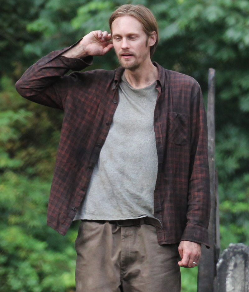 I think this is how he normally looks size-wise. AFAIK he has to put on about 10 kg of muscle for True Blood. He looked the same more or less when he did Melancholia – minus the dirt obviously.