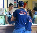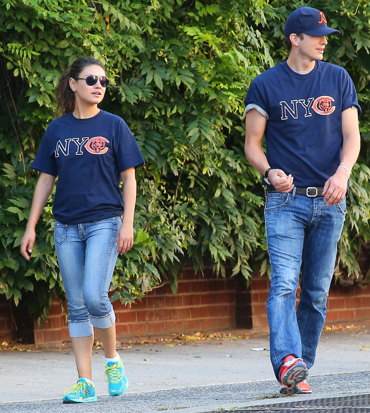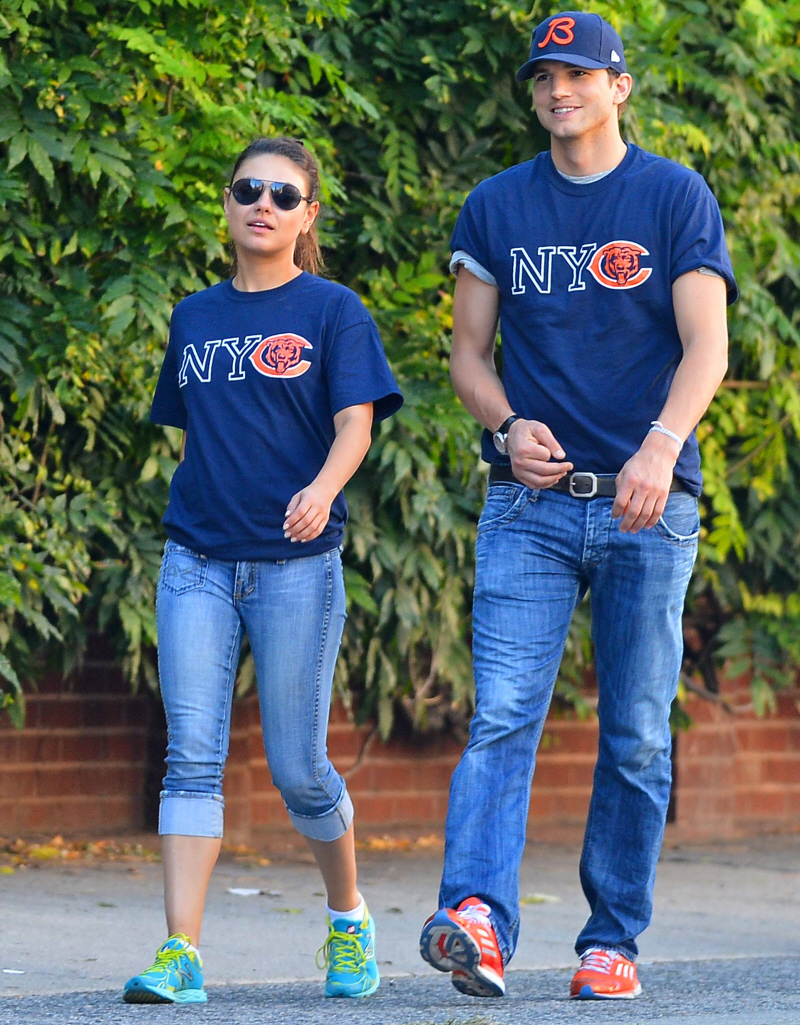 It finally struck me today, as I was looking at these photos of Mila Kunis and Ashton Kutcher – they fit together in some strange way. I’m not reversing my die-hard stance that Mila is too good for Ashton, or that Ashton is a massive d-bag. I’m just saying… I guess I see why it works. I guess I see what each one brings to the relationship. Like, I can’t imagine Demi Moore ever wearing a t-shirt (“Win or lose, we still booze, Chicago Bears fans of NYC”) and sneakers and going out for ice cream with Ashton after seeing a game, you know? And maybe that’s what Mila wants – something uncomplicated. I believe this is uncomplicated between them right now. But I believe it will get more complicated between them in the months to come. Like, was Ashton ever married to Demi, and if so, shouldn’t he get a divorce?