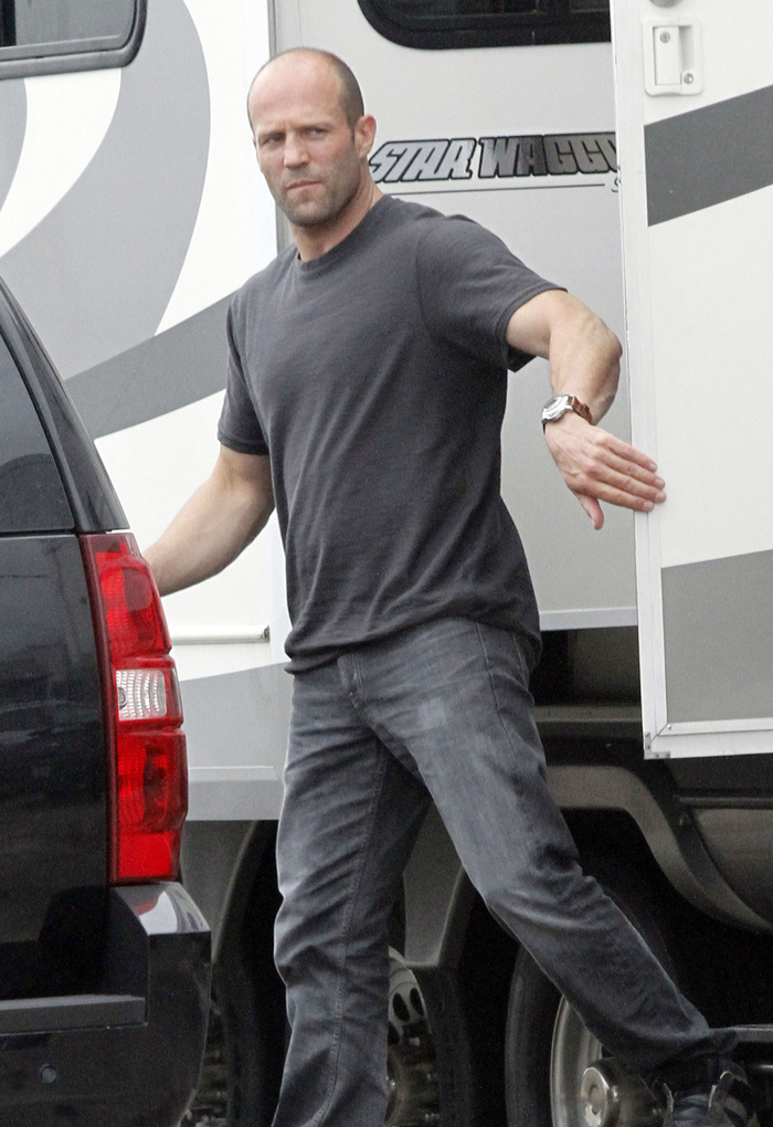 In the film, Winona plays the tough, biker-girl sidekick of a methamphetamine drug lord portrayed by James Franco (naturally), who is mercifully not present in these photos because I don’t think I could handle his pretention at this very moment while taking in the shock of Winona’s wild new hair. Oddly enough, this is not the Ryder-Franco movie that we heard about a year ago, which means that now there are two of them. Winona had best be careful, or she’ll find James hiding in her trailer whilst taking photos of her butt and calling it AAART. Fortunately, Jason Statham was present on the set, so we do have a picture of him, and his hair never changes.