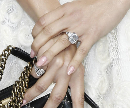 Earlier this week, Jennifer Lopez, Casper Smart and Emme Anthony attended the Chanel show in Paris. It was all part of J.Lo and Casper’s whirlwind international extravaganza, much of it probably business-related. But I noted at the time that considering Jennifer and Casper had found themselves in Paris, “the most romantic city in the world,” perhaps they would at long last get engaged. That’s what a lot of people thought, apparently. And many sites began to play “Let’s Start An Engagement Rumor” when they saw J.Lo’s engagement-ring-finger bling at the Chanel show. Here’s a closeup: