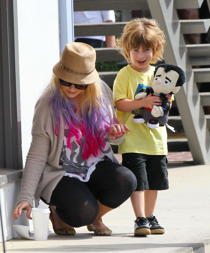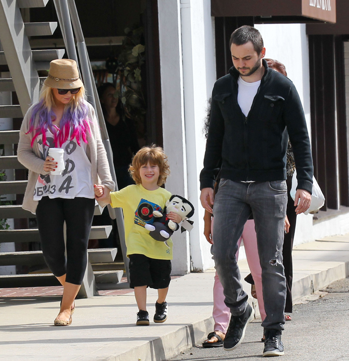 Here’s a few photos of Christina out with boyfriend Matthew Rutler and her son, Max, shopping out in Brentwood. Max has a new Vampy Vince doll in hand and seems quite pleased as a result. Cute kiddo.