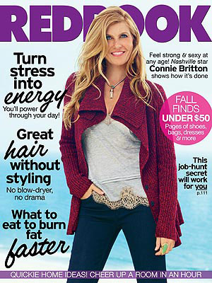 The lovely Connie Britton covers the November issue of Redbook, and People Magazine has some advance quotes for us. I know Connie, 45, from American Horror Story, where we saw her character go through hell before finally achieving a macabre sort of peace. (I won’t give away any spoilers in case you have ambitions of watching the DVDs. I give it a B, it’s a fun, scary show that pulls you in, but it often seems ridiculous. I’m totally watching it this season!) Anyway we’ve seen Connie looking amazing on screen (I want her hair!) and having some hit and miss moments on the red carpet. It’s nice to see her styled so well in this photoshoot. Is that sweater photo an homage to Ann Margaret in Bye Bye Birdie? That’s what I’m reminded of when I see a gorgeous redhead in just a sweater, but I guess Ann’s was much different than this one.