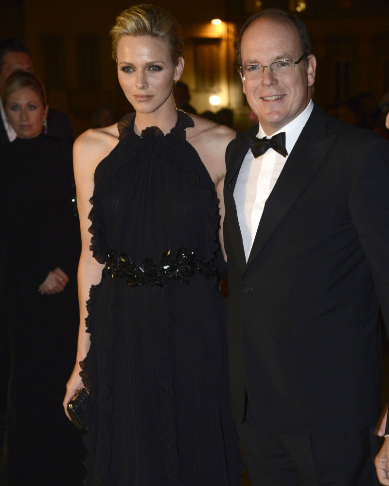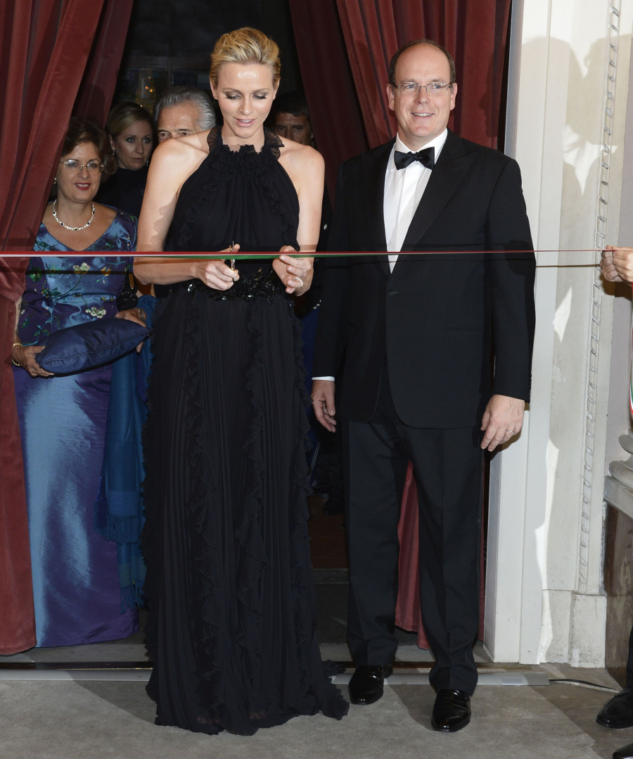 Poor Princess Charlene. Pity her and her S-O-S blinking at formal events. These are new photos of Charlene and Albert in Florence, Italy yesterday. They were there on some kind of formal royal visit , part of which was some kind of gala called the 2012 Ballo del Giglio (“Ball of the Gigolos”? My Italian is awful!). Charlene wore this beautiful black Gucci (from the Fall 2012 line) gown for the gala – this is one of the prettiest dresses I’ve ever seen on Charlene. She has that strong swimmer’s body with those broad shoulders… and her body doesn’t always look very good in dainty couture. But I like this gown on her a great deal. She should do halter-dresses more often. Something negative: the ruffles are getting on my nerves.