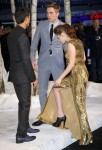 Kristen’s dress looks like it weighs a ton and probably does. It’s way too old and harsh for her. Reminds me of some very bad mother-of-the-bride dress at a nouveau riche wedding high on cost but low on taste. The fact that she hikes up the skirt and we see the inside construction doesn’t help.