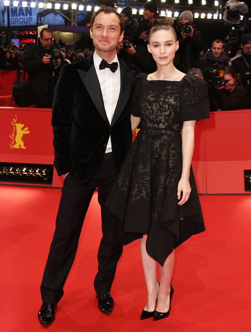 Here are some pretty pictures of Jude Law and Rooney Mara in Berlin yesterday for the photocall and Berlin Film Festival premiere of Side Effects. I don’t know why Channing Tatum didn’t go to Berlin, but I’m not complaining about the extra Jude-Time we’re getting. He’s looking incredibly hot these days. As for Rooney and her hit-or-miss styles… for the photocall (the pants/vest thing), she wore Balenciaga and for the premiere she wore a black lace Valentino gown/dress. She wore Louboutins with both outfits. Even though I’m not crazy about the sleeves on the Valentino, I like the overall look. She’s really tiny, isn’t she? She’s SO petite and she has such bad posture. That’s starting to be my tic with Rooney – like the tic I have with Kristen Stewart biting her lip and rolling her eyes. Rooney is always slouching and slumping. It bugs.