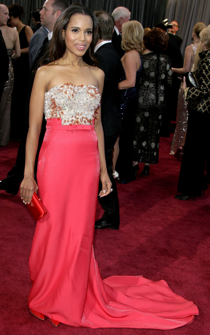 Also wearing a shade of red (but it looks more coral here)? Kerry Washington in MiuMiu. This was actually one of my favorite looks of the night! Kerry did something to take away those horrible bangs she had throughout the Oscar season (maybe the bangs were detachable?), and her dress moved beautifully. I think she’s gained some weight back after looking too slender as well. All in all, Kerry was one of the best looks of the evening!