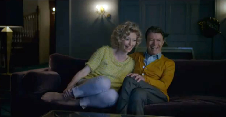 Now we’re presented with the ultimate opportunity to watch them in action together in this short film/video, which also functions as proof that Bowie and Tilda are in fact not the same person. In this video, Tilda plays the wife of Bowie and, at one point, she even hops onstage and lipsynchs the lyrics as they play. What fun: