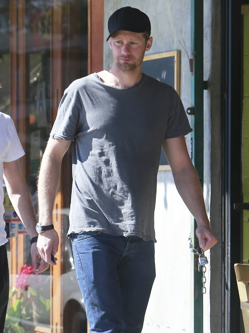 Sorry, I was struggling to find something decent to cover, and it was either Alexander Skarsgard or Jude Law’s moobs. Maybe I’ll include a few photos of Jude too, just to mix it up a little. I’m constantly amazed by the fact that Alex can go from a smoking-hot lanky Viking in a suit, on a red carpet (or Calvin Klein commercial), to a dirtbag-looking awkward-seeming dude in real life. Whenever I see candids of Alex just walking around in his baseball cap and jeans, I realize that his proportions really are crazy, and that he needs better bumming-around clothes. I get that his casual clothes are just for running errands and everything, but… I don’t know. Maybe a decent pair of khakis and some new t-shirts? If we hold Mila Kunis to that standard (where we feel she should look presentable and attractive in candids because of her Dior contract), shouldn’t we hold Alex to that standard too?