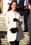 Kate wore a rather mod/awesome wool crepe “Redgrave” coat by Goat, which was over a black and white minidress by Topshop, black tights/hose and a pair of Kate’s favorite black shoes (she’s not a shoe person). Although I’m typically against Peter Pan collars (I associate them with Rosemary’s Baby, no joke), I particularly like this gorgeous coat and I love the clean, mod vibe Kate is working. I love a smart black-and-white look, and Kate did well here. One complaint: Kate’s hemline problem has overtaken her Button Problem. The shortness of this skirt does not say “I’m sorry for your grief.” That hemline says “My legs are holding up really well with this pregnancy, don’t you think?”