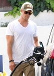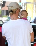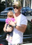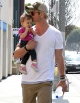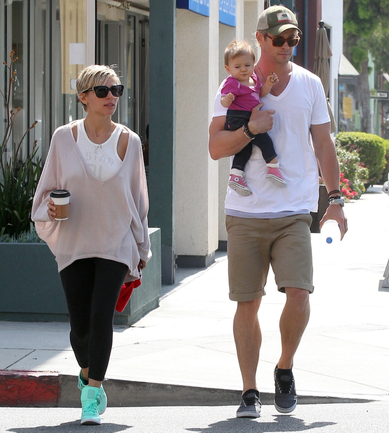 Since I know many of you cannot resist photos of A) hot, beefy men, B) babies and C) giant, bulging arms, here are some photos of Chris Hemsworth, Elsa Pataky and their daughter India Rose. They were out and about in Venice Beach on Saturday, going out to breakfast with India and then stopping for gas. How adorable is India Rose? This is the first time I’ve really paid attention to how she looks – she’s so cute!! She’s got a very expressive face, and I love her little pink Chucks. I love that whenever this family is out, Chris is always holding his daughter – he seems like a very hands-on father. You know what needs to go though? Chris’s man-Scrunchies.