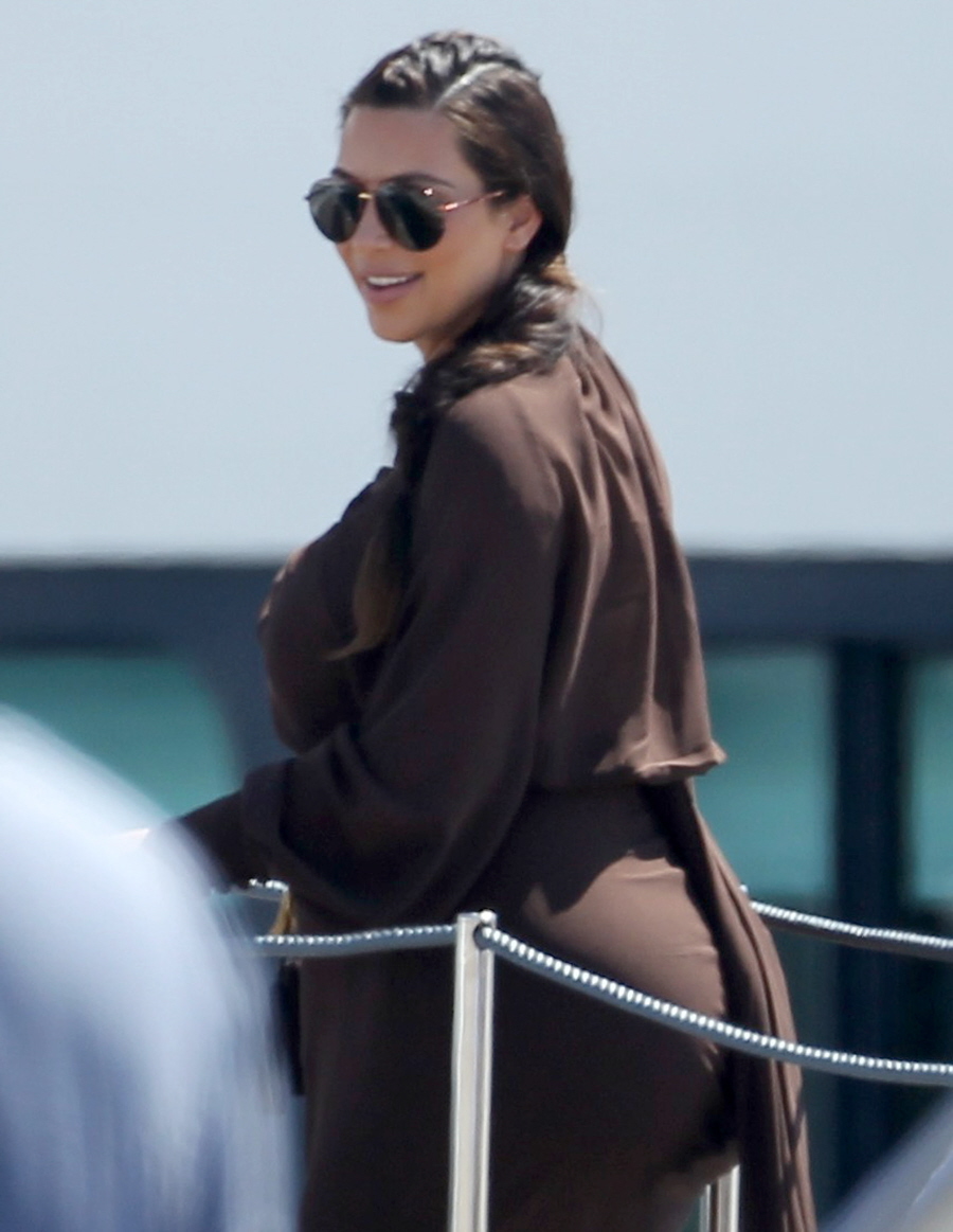 I wasn’t even going to talk much about these photos until I realized that poor Kim was the only one in a muumuu for all of these particular photos. Imagine going to Greece and spending time on a yacht only to have to wear a muumuu the whole time! I did see pics of Kim in a bikini at some point though, we just don’t have those pics (you can see them here). Again, I’m not saying Kim is “fat” nor do I want other people to call her that. But I am simply amazed by how it really seems like her ass is pregnant. It’s mesmerizing. Also – I guess I’m calling BS on her due date being mid-July. I think she’s due a lot sooner.