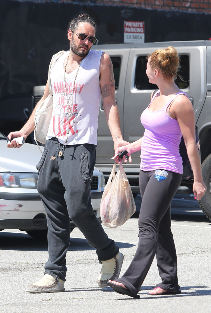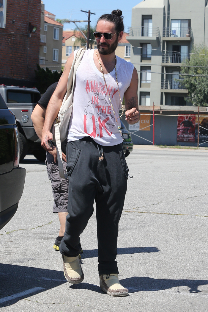 Speaking of the devil Russell Brand, here he is departing yoga class on Monday and killing my lady boner with that Miley Cyrus post-pilates bun. Rusty’s even wearing an “Anarchy in the UK” t-shirt just like Miley’s been doing lately. Conspiracy.