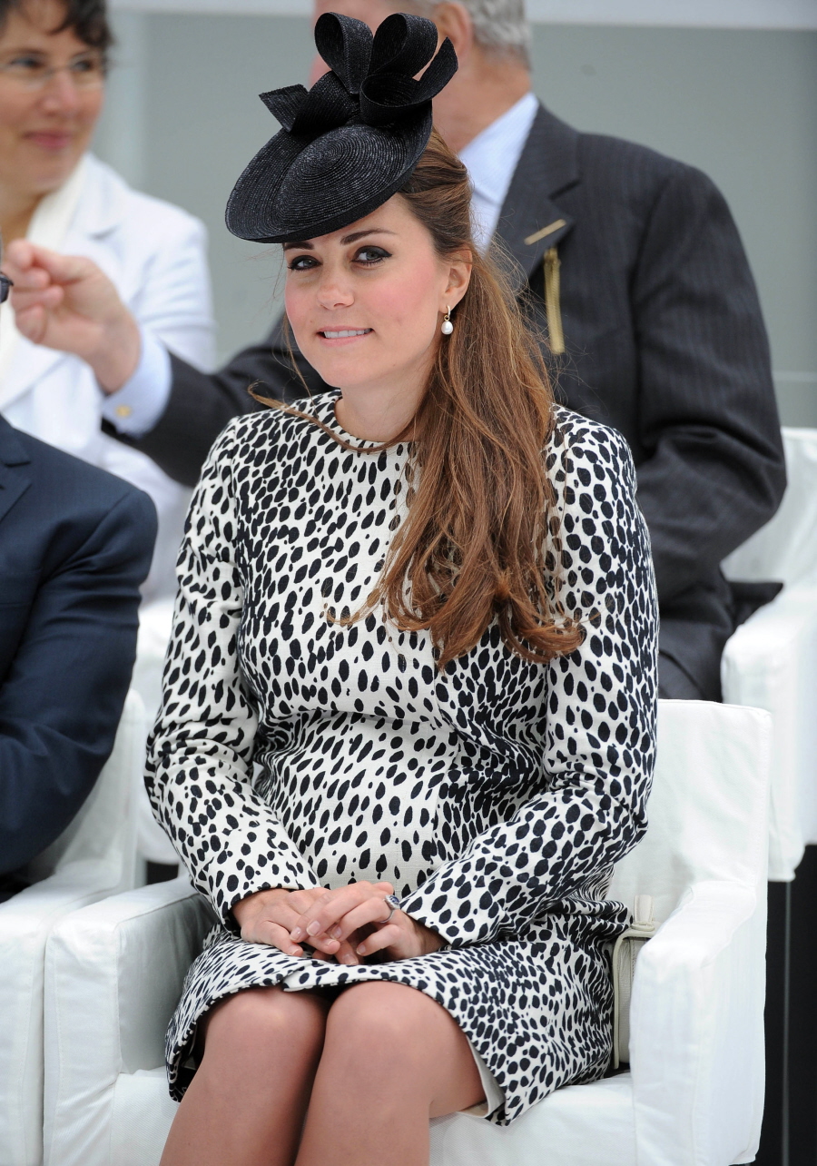 Following in the footsteps of Queen Elizabeth II and her late mother-in-law Princess Diana, Kate Middleton traveled to Southampton, England, on Thursday, June 13, to name Princess Cruises’ latest ship, the Royal Princess. The pregnant 31-year-old dressed her baby bump in a $265 dalmatian print coat by Hobbs and wore a black fascinator for the occasion. Looking radiant as ever, the Duchess of Cambridge walked the blue carpet as the Band of Her Majesty’s Royal Marines Portsmouth and The Pipe Band of 1st Battalion Irish Guards gave her a musical salute.