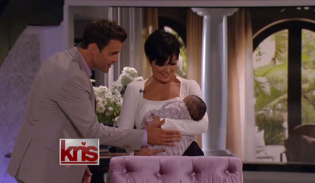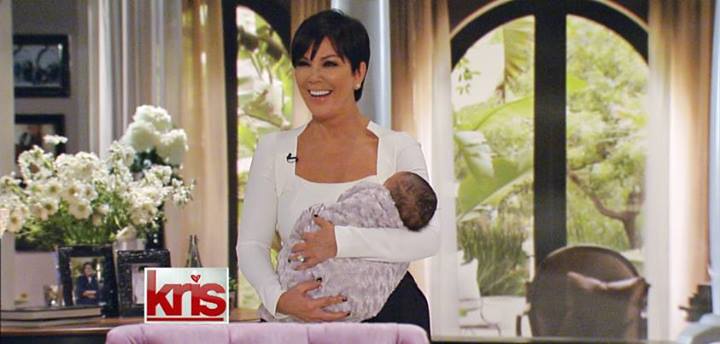Kris Jenner’s not-much-anticipated talk show aired yesterday. I’m not going to front like I watched the whole thing, but I saw a few minutes of it and read a few recaps so I feel more than prepared to pass judgment. A lot of outlets are focusing on the fact that Kris faked out the audience by bringing on a small baby at the end of the show that easily could have passed for her latest grandchild, North West. Of course Kanye is putting his foot down, Kim probably wants to sell the photos for a tidy profit, and it wasn’t North West at all. Kris even promoted the show by tweeting the above picture. It turns out that it was the new baby of her stylist, supposedly. When I see PMK and a random baby I imagine a Disney villain scenario involving traded souls and hoarded body parts. Kris explained that people ask her about the baby a lot but that “Kim’s just got to do that on her own time. Let her have her privacy for a little bit and calm down and when she comes out she comes out.” Yeah, Kris is in no way happy about that.