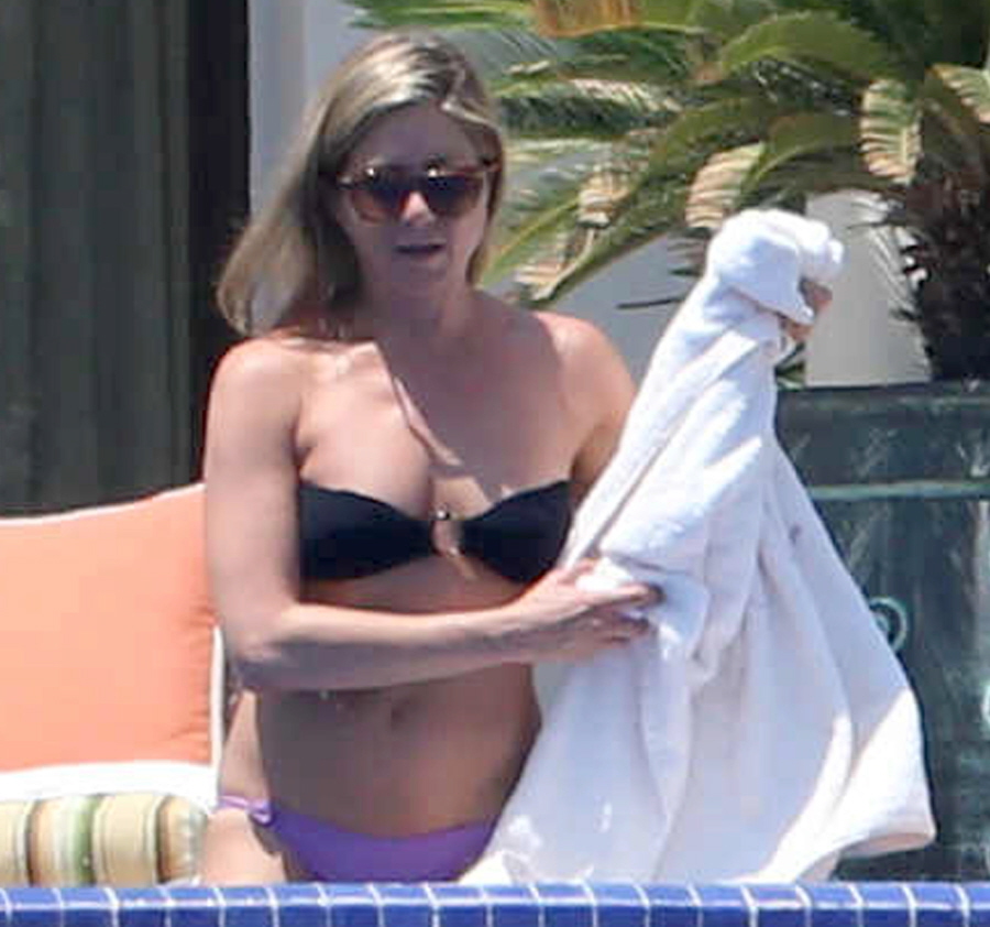Eagle-eyed JustJen fans will notice a few slight differences in these photos as opposed to the Cabo photos from Thanksgiving and Christmas 2012. For one, Justin finally got a real pair of swim trunks. He’s no longer wearing those black denim shorts. And… that’s like the only difference. Seriously. Aniston is even wearing an old bikini that we’ve seen before. Her hair looks the same, everything else is the same. They’re couple-vacationing with Jason Bateman and his wife.