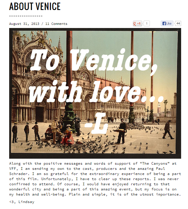 Lindsay Lohan claims she was never going to Venice, her director disagrees: Viewing Photo You are viewing the page for a single photo. Click here to return to the post or view more photos in the gallery below << last image next image >> << last image next image >> Return to the post: Lindsay Lohan claims she was never going to Venice, her director disagrees