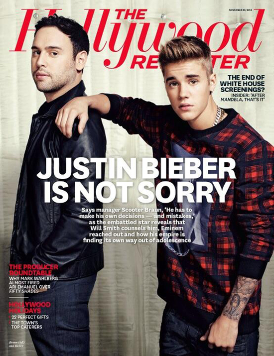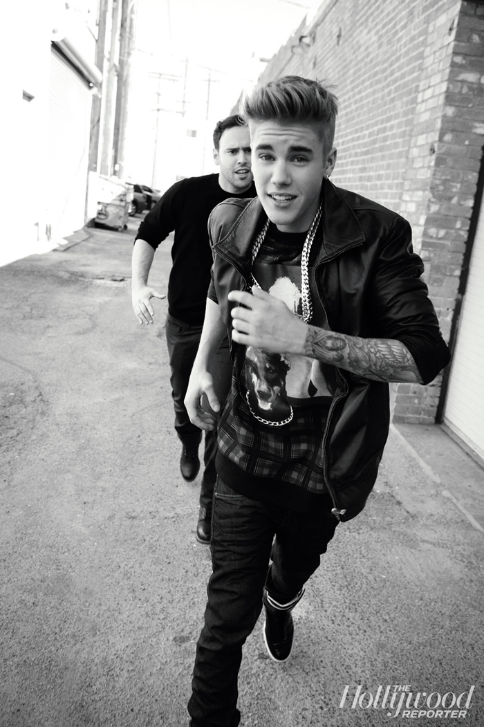 Justin Bieber and his sketchy manager, Scooter Braun, cover this week’s issue of Hollywood Reporter, and it’s clear that this interview took place because the Bieber camp is in crisis mode. Falling ticket prices, a lack of sold-out concerts, and far too many scandals to count will do that to a pop star. The photoshoot is hilarious and features Scooter running after Justin like, “I’m gonna catch that little bugger!” Oh and Justin is pretending to pray. Ridiculous.