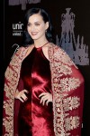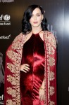 Katy Perry attended last night’s UNICEF Snowflake Ball wearing a shiny red halter dress and a carpet cape. This is Naeem Khan, by the way, and the entire outfit is a bit too much for even overly dramatic Katy to handle on a red carpet. The lighting is terrible here, so maybe the dress isn’t as bad as it appears in these photos. The color is very rich and gorgeous. Katy did change outfits (into a leopard-print dress that truly works) for her performance, and you can see that dress here.
