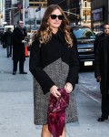 Here are some new photos of Julia Roberts last night in NYC. She wore the purple Proenza Schouler dress to the NYC premiere of August: Osage County, and she wore the grey and black Stella McCartney coat to The Late Show with David Letterman. Can we just take a moment to discuss how weird it is that Julia wore the Proenza Schouler to a NYC premiere in December? I would be side-eyeing this choice if it was an LA premiere too – it’s just too summery in general – but it’s flat-out insane that she wore this in NYC! That being said, it’s a cute dress and it’s interesting to see Julia in something so short and figure-enhancing. She’s been wearing a lot of sack dresses recently, so this is a new look for her.