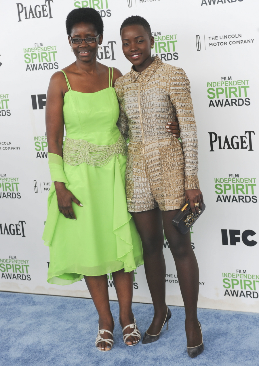 Lupita’s make-up is nice (no bright eyeshadow!) but her outfits have been pretty bad lately. A dress would have been more appropriate for this event. I really hope she does herself a favour and does not wear Stella McCartney or Marchesa to the Oscars. I realize her mom isn’t a celebrity, but Lupita should have worked her connections to get her mother a better dress too. That neon green dress is simply awful.