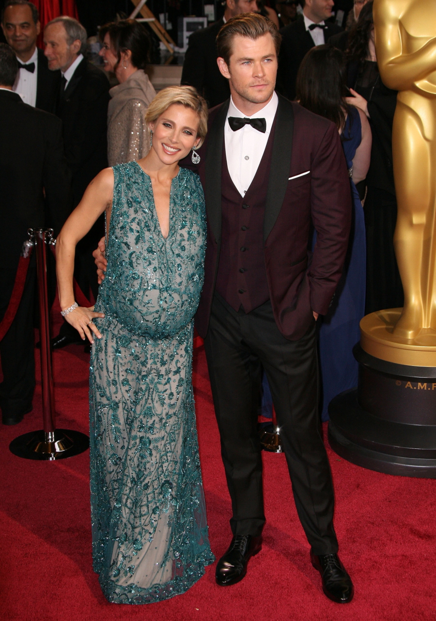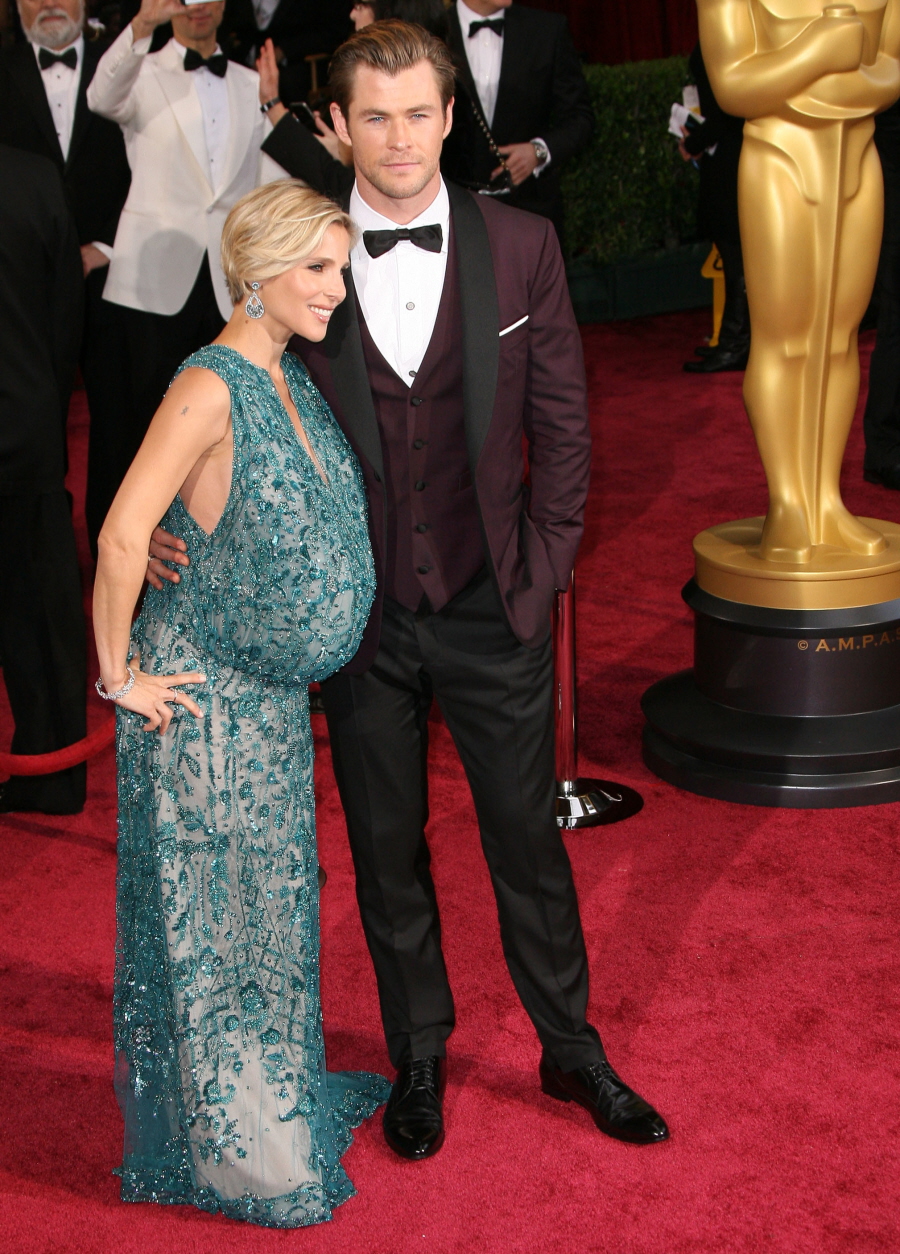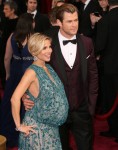 And because Charlize presented with him (and he put me to sleep), here’s Chris Hemsworth and his ready-to-pop wife Elsa Pataky. I didn’t even see them on the pre-shows, so this is my first glance at Elsa. I do feel for her. I mean, she’s beyond thrilled to be on the red carpet and she’s bathing in all of the attention, but I bet she was uncomfortable too. Elsa wore Elie Saab, just like Angelina Jolie. I would have loved to have seen this color on Angelina, but it works on Elsa. I mean, what do you want me to say? Elsa looked nice. It wasn’t a bold, avant-garde maternity choice but I don’t expect that from her. They make an attractive couple. Okay, I’ll give it to you Hemsworth-loonies… he looks sort of over it. But I doubt he actually is.