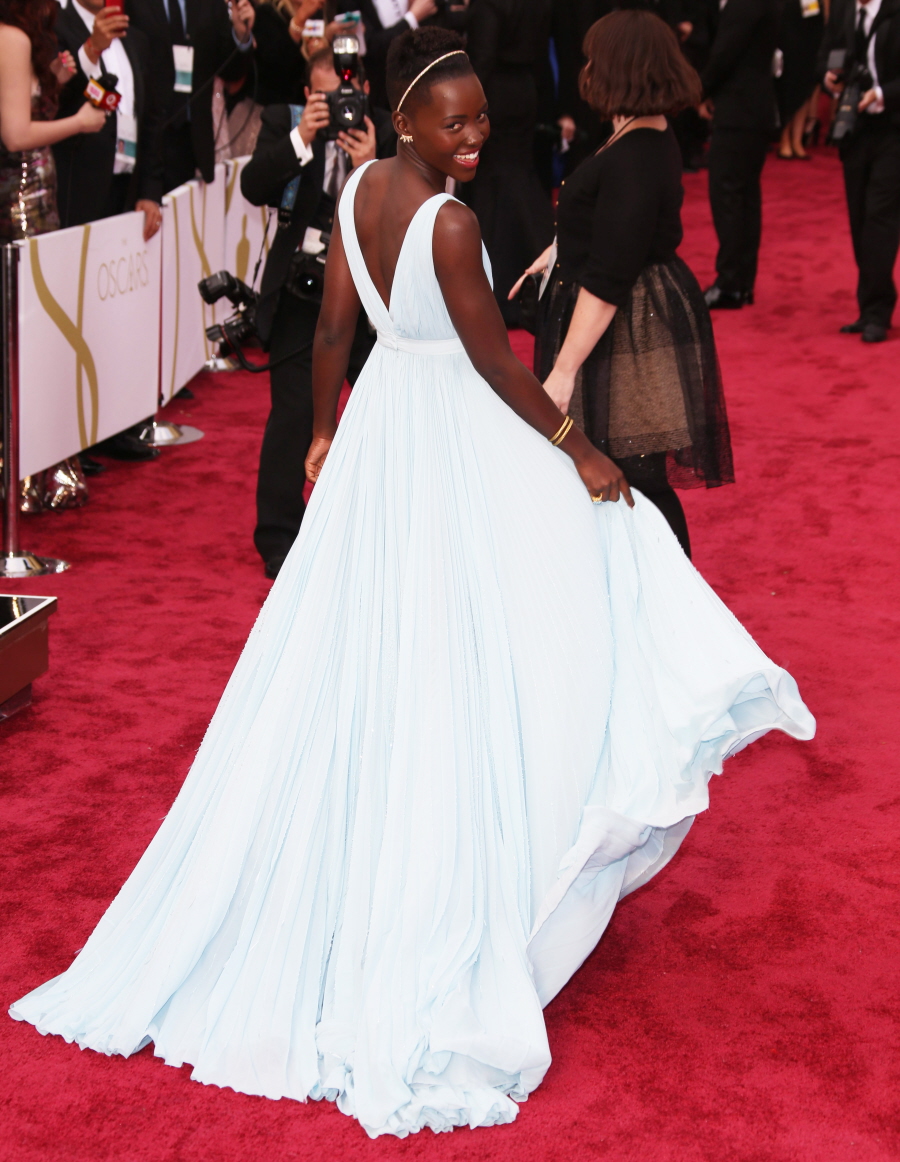 loved this dress , it looked even more beautiful in motion ,there are couple of pics where she is almost twirling ,making that fabric look all floaty and dreamy ,she reminded me of those disney princesses,i think it was Cindrella who had a similiar blue gown and her speech was so thoughtful,eloquent and precise ,i hope those hollywood morons give her more opportunities ,i nvr had the guts to watch 12 YAS ,but damn that one clip of Lupita from the movie where they showed her beggin Fassy’s character just to wash herself was more than enuff to kill all that argument abt who was the winner in that category ,can’t blieve ppl were actually talking abt not givin her an award bcoz her character ws one that naturally garnered sympathy ,no,, Lupita earned it fair and square .