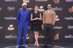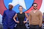 Here are some pictures of Chris Evans, Scarlett Johansson, and Sam Jackson at some shopping mall event in Beijing for Captain America: The Winter Soldier. This was a press conference in a shopping mall. No wonder Chris had to pair his sunglasses with his new beard. The crowd must have been overbearing. He’s a massive contrast to Sam Jackson’s “take no sh-t” presence. Sam is the coolest.
