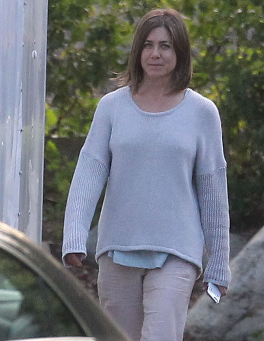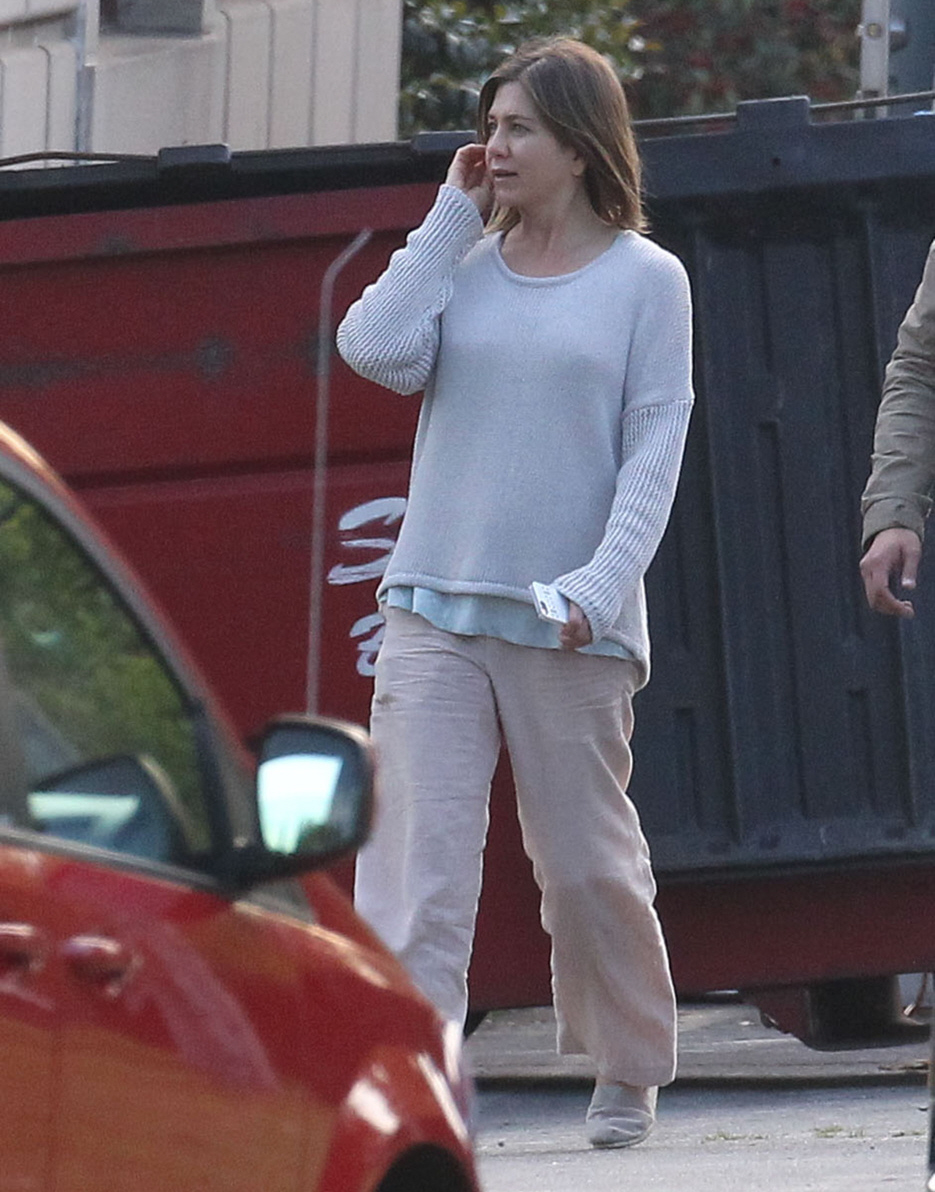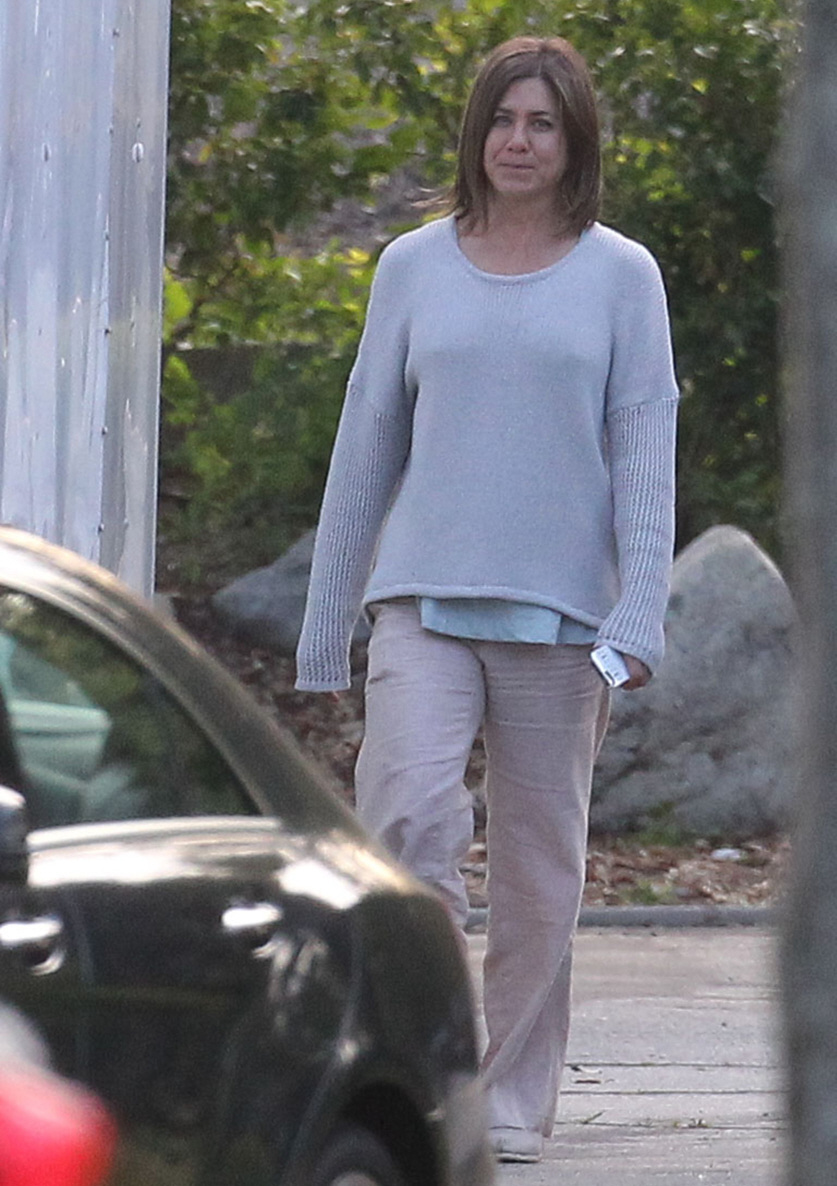 Here are some new photos of Jennifer Aniston on the Pasadena set of her new film, Cake. It’s a smaller drama (or a black comedy) which Jennifer is producing herself. It’s about a woman grieving a dead husband, I think? And she’s supposed to look like this, which… props to Jennifer. Usually she only does movies where she can look cute and wear wedges and scarves. She looks properly grief-stricken in these photos. The film also stars Sam Worthington, William H. Macy, Anna Kendrick and Chris Messina.