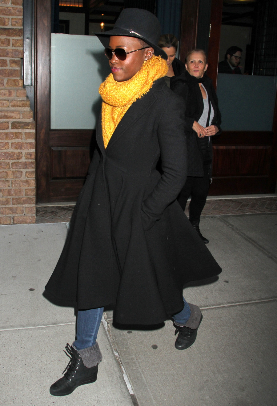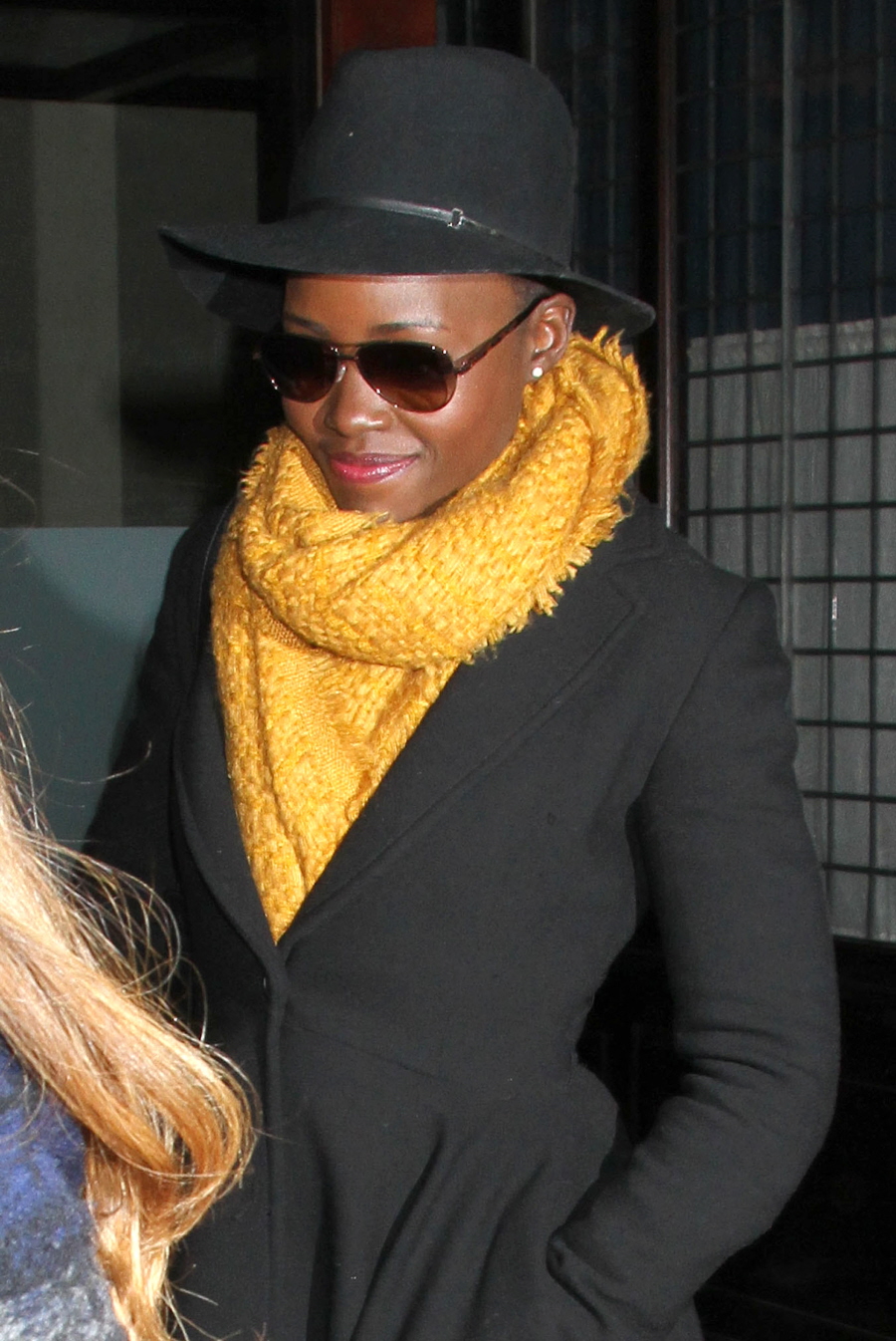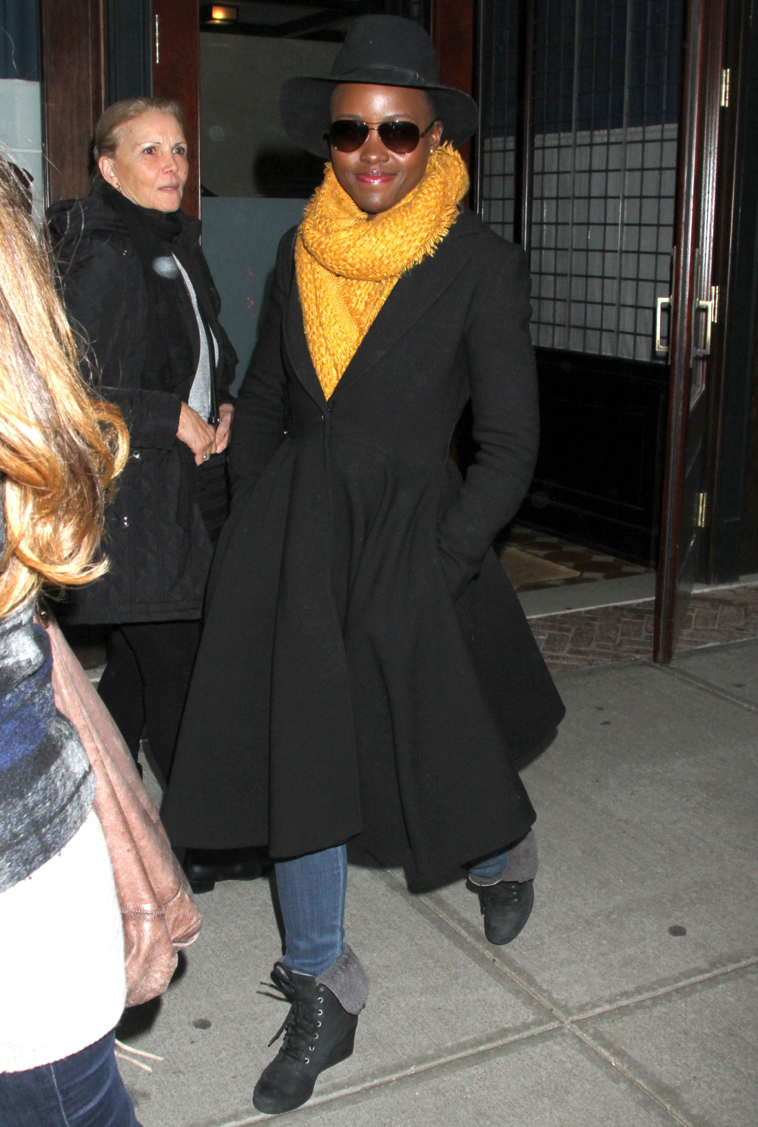This is the most dressed-down look I think I’ve ever seen from Lupita Nyong’o. Lupita was pap’d outside of the Greenwich Hotel in NYC yesterday. I think she stays there a lot, but she also shares an apartment (or something?) with someone (?) in Brooklyn. I know she has some family money, but I also think she’s been living out of hotels for several months now, which must get expensive. Still, I bet the Greenwich Hotel is a lovely place to have a romantic rendezvous. Perhaps Jared Leto. Perhaps K’Naan. Perhaps Benedict Cumberbatch (God, I wish that was true).